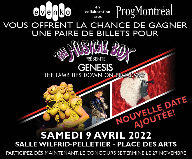 Une deuxième date a été ajoutée pour le légendaire groupe hommage à Genesis montréalais, The Musical Box, qui présentera son spectacle « The Lamb Lies Down on Broadway », à la Salle Wilfrid-Pelletier de la Place des Arts, le vendredi 8 avril 2022 et aussi en ajout, le samedi 9 avril 2022.